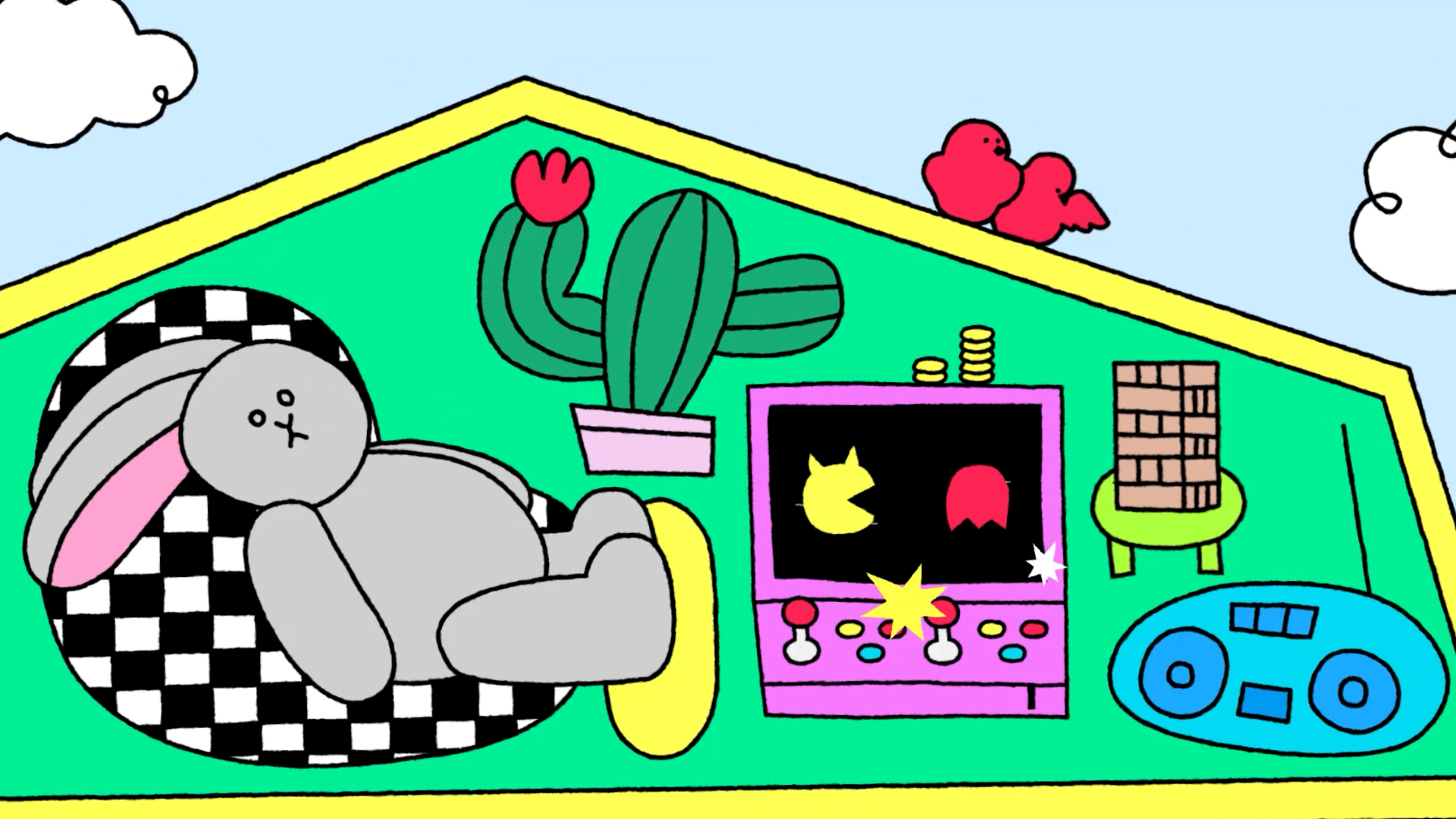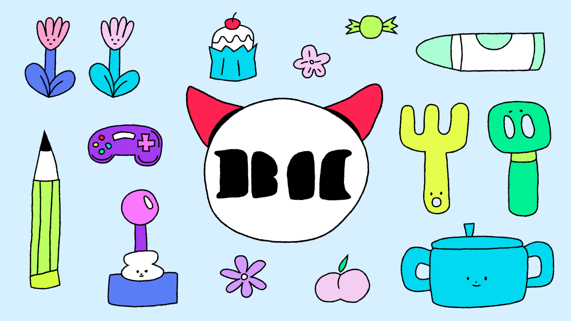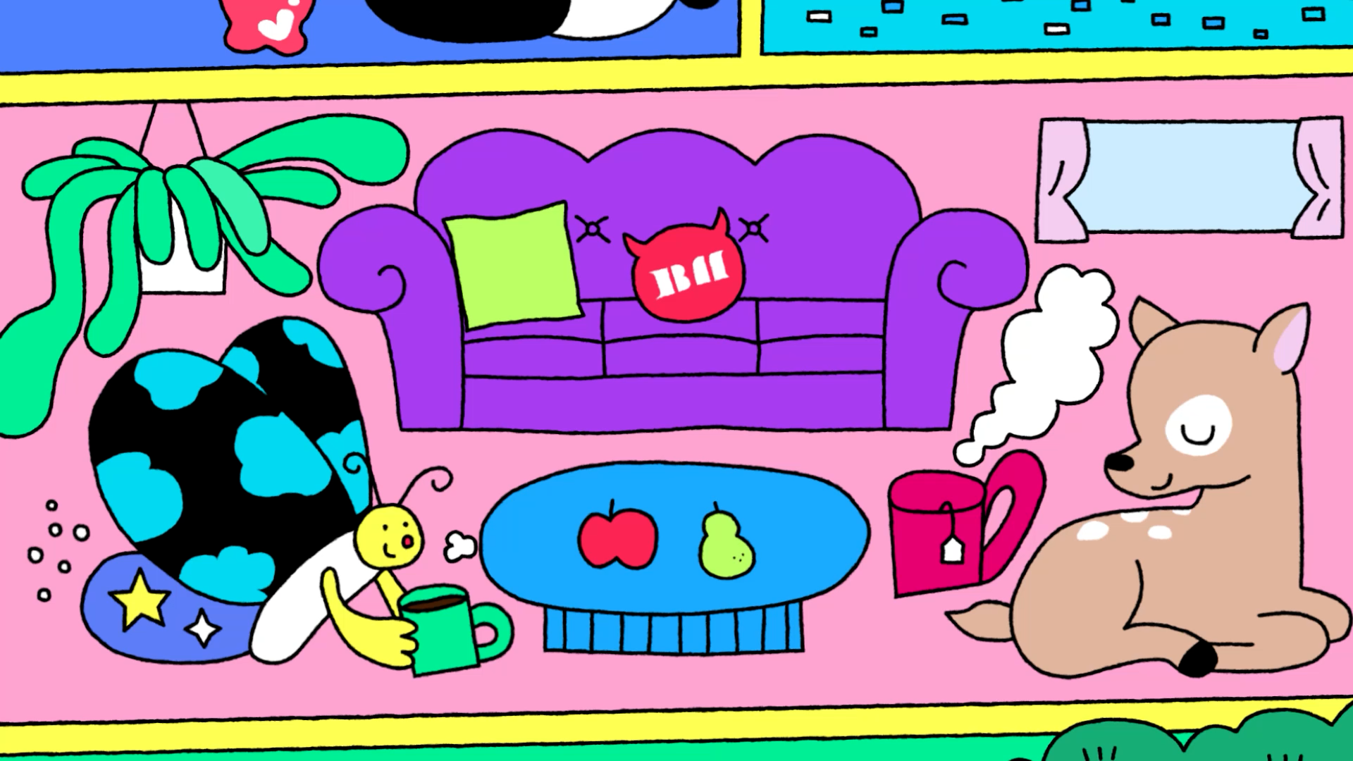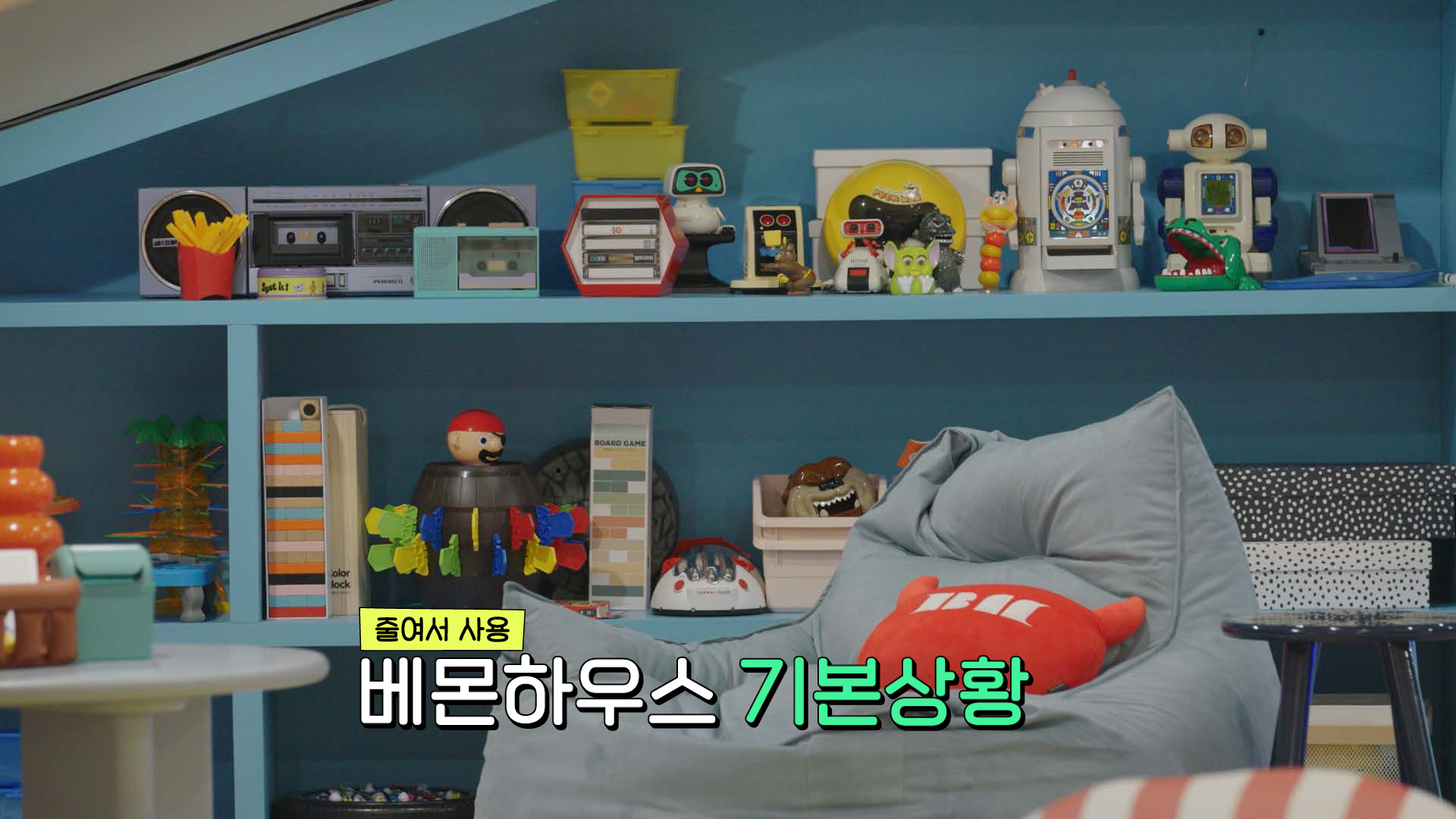 The title style frames expand upon the contrasting color palette established in the logo, aiming to create a visually engaging and energetic opening for the content. BAEMON HOUSE is treated as a spatial stage, where various activities unfold through cross-sectional movements of the house, guided by animals and objects inspired by the members’ personal preferences. Playful objects and vibrant color layers come together to deliver a joyful and lively introduction to the content.