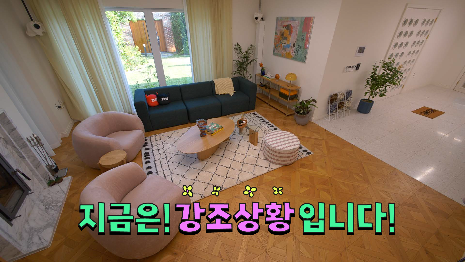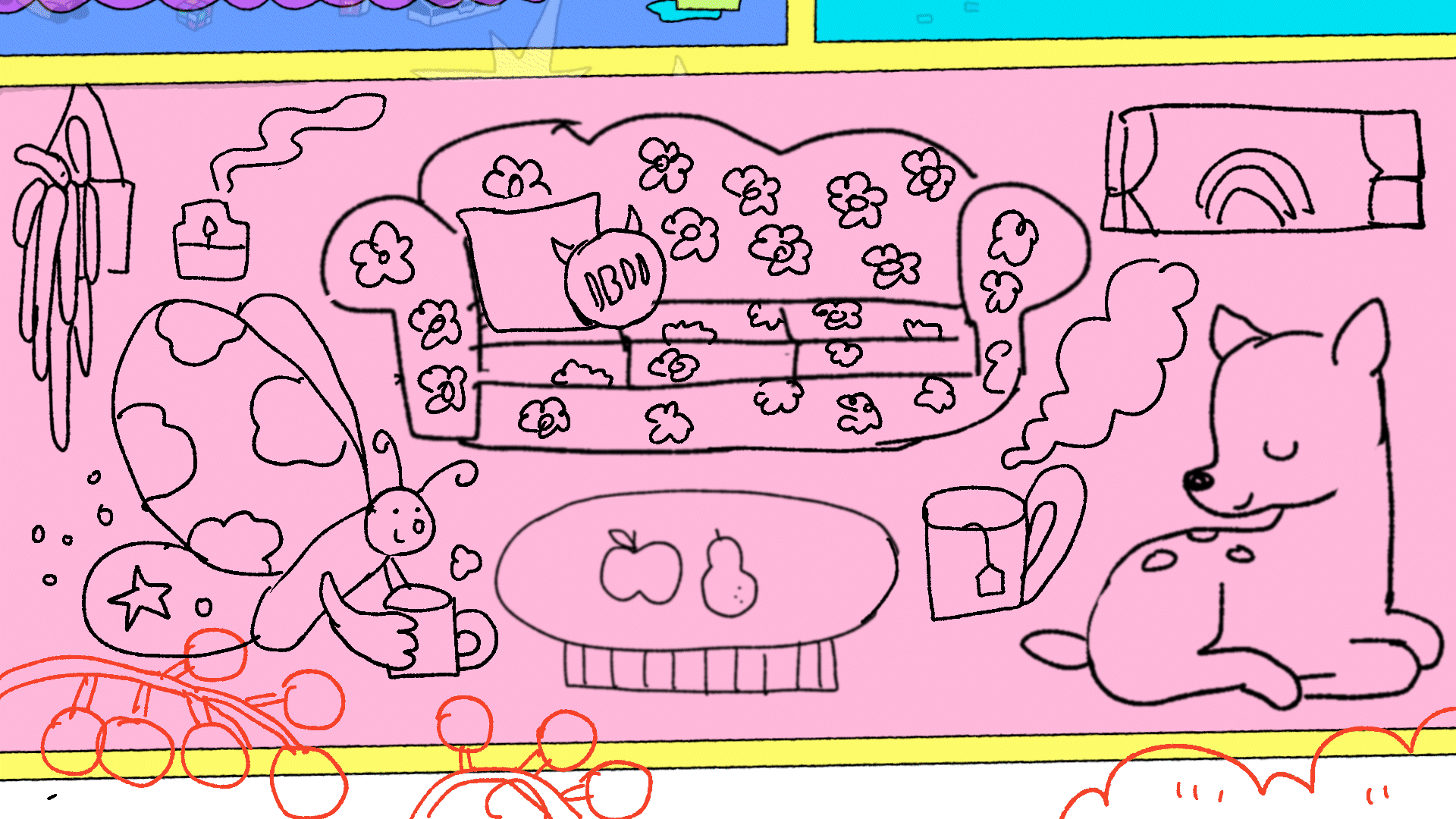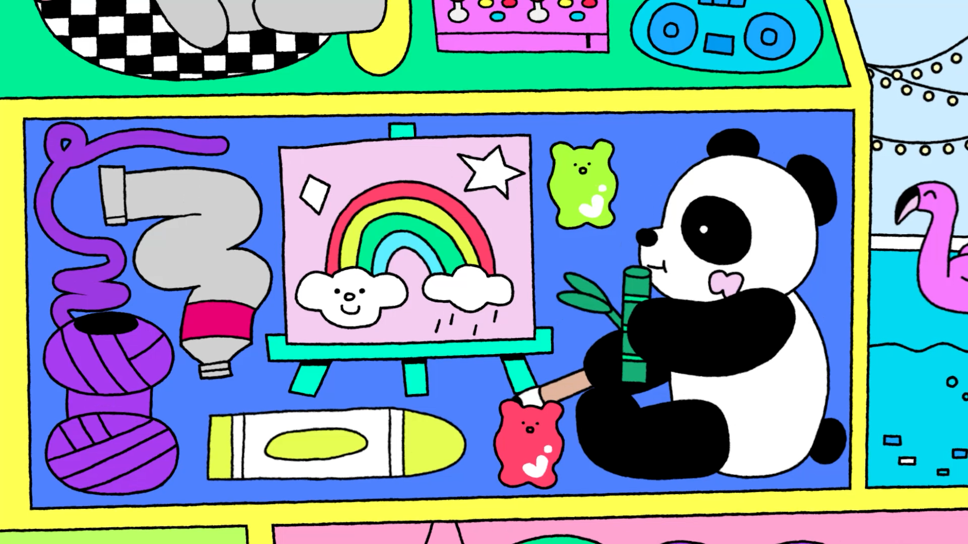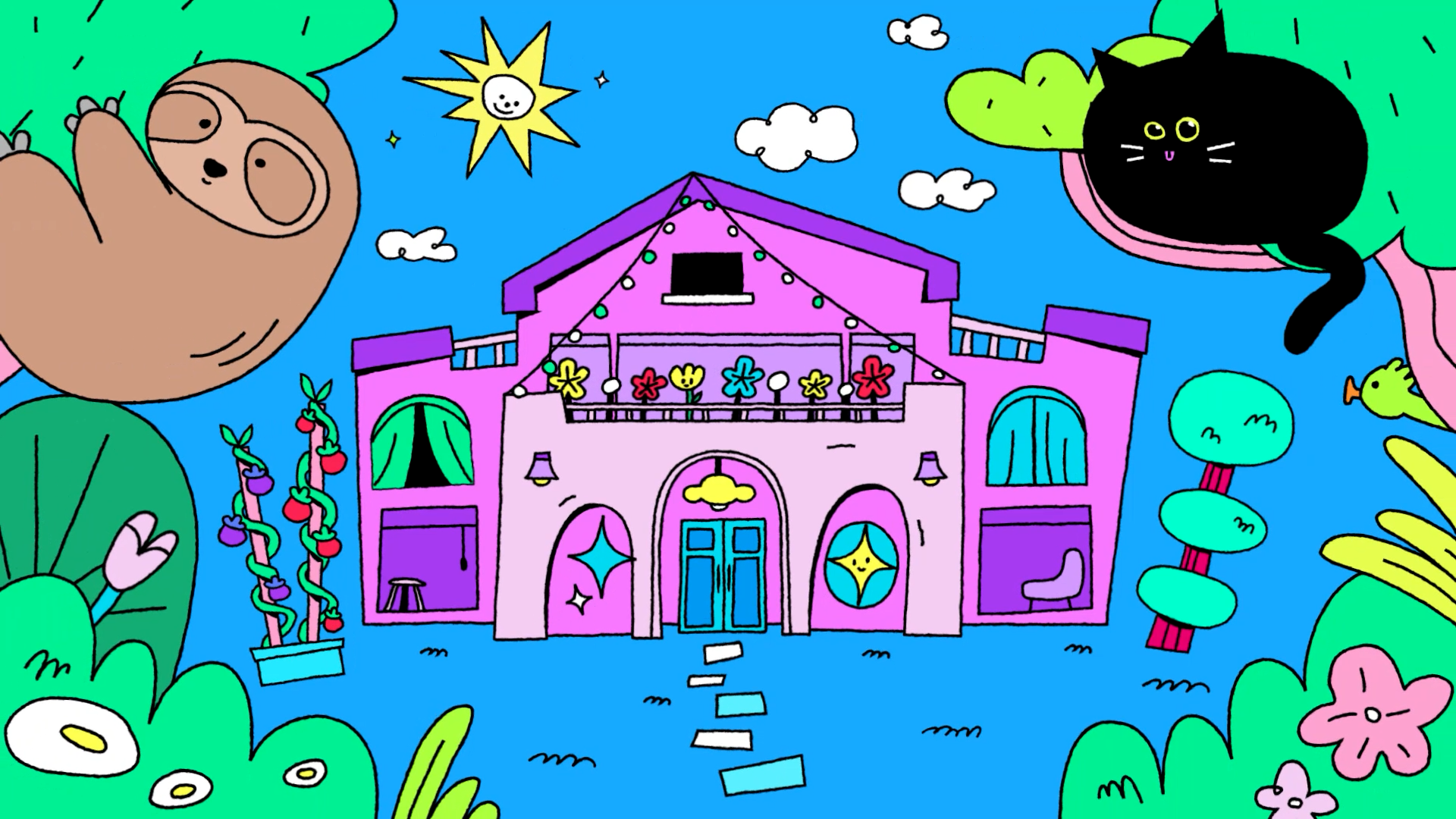 The title style frames expand upon the contrasting color palette established in the logo, aiming to create a visually engaging and energetic opening for the content. BAEMON HOUSE is treated as a spatial stage, where various activities unfold through cross-sectional movements of the house, guided by animals and objects inspired by the members’ personal preferences. Playful objects and vibrant color layers come together to deliver a joyful and lively introduction to the content.