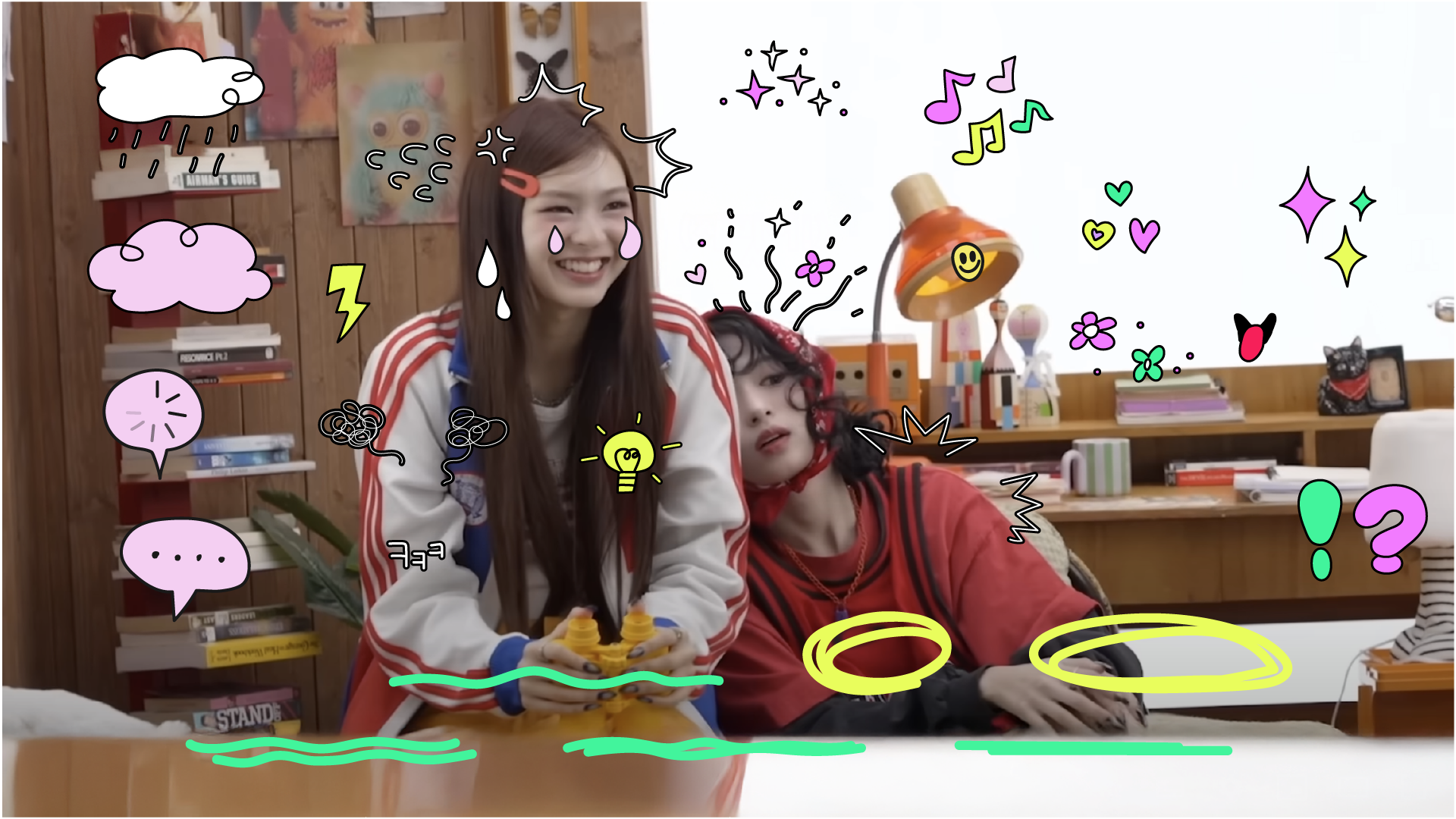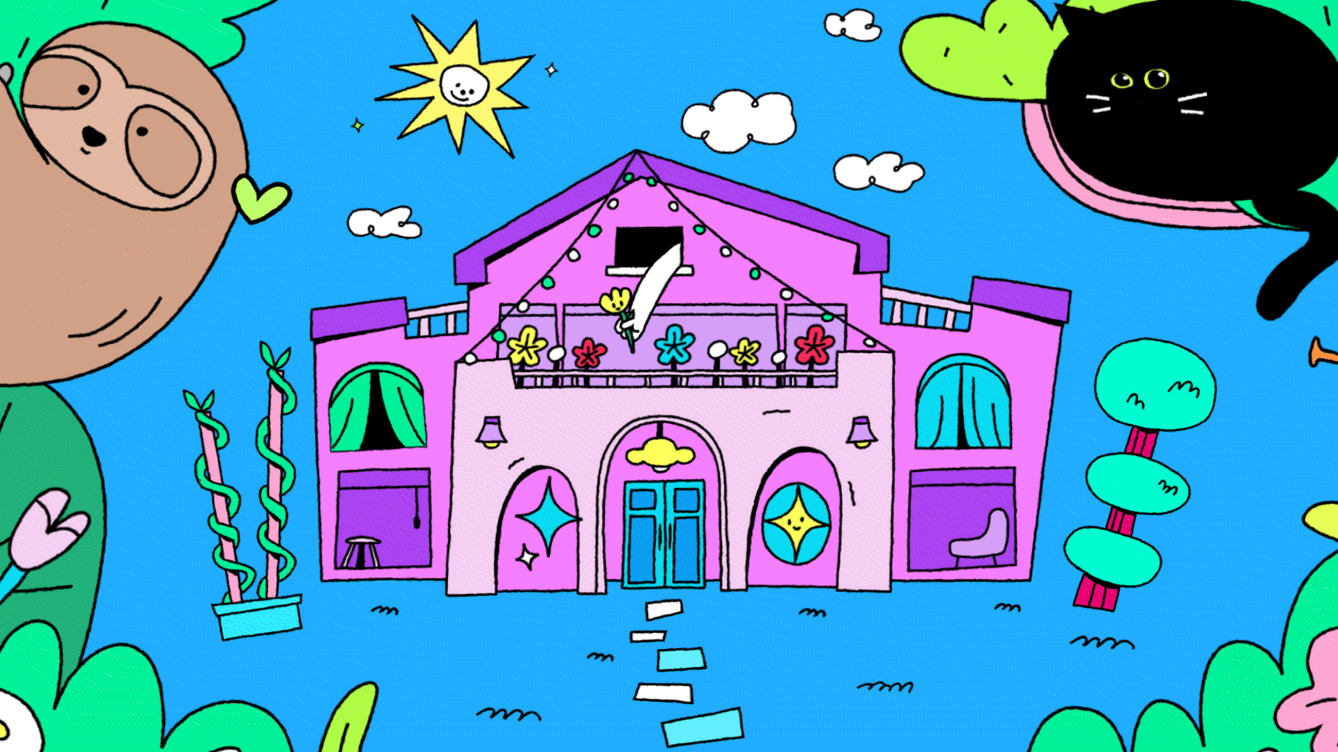 with careful consideration given to the balance between character expression and readability, leading to the most intuitive and scalable solution. The image of the girls gathered under one roof is expressed through hand-drawn, irregular shapes, while the contrast between lemon yellow–mint on the top line and magenta–purple on the bottom line creates a bright and energetic tone.